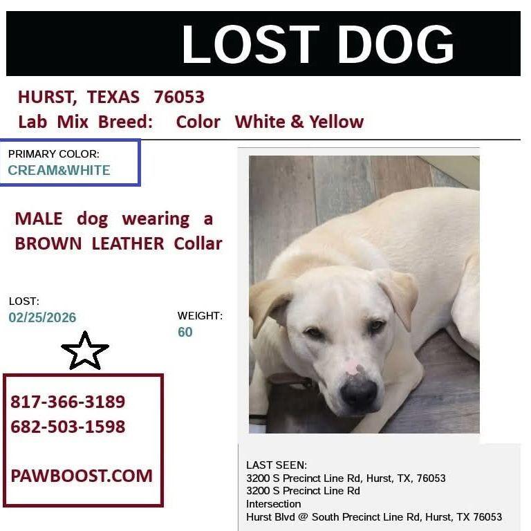 Male Labrador mix Cream white and yellow. Lost Feb 25th. Reward Available for a SAFE Return. $1,000. No Questions Asked